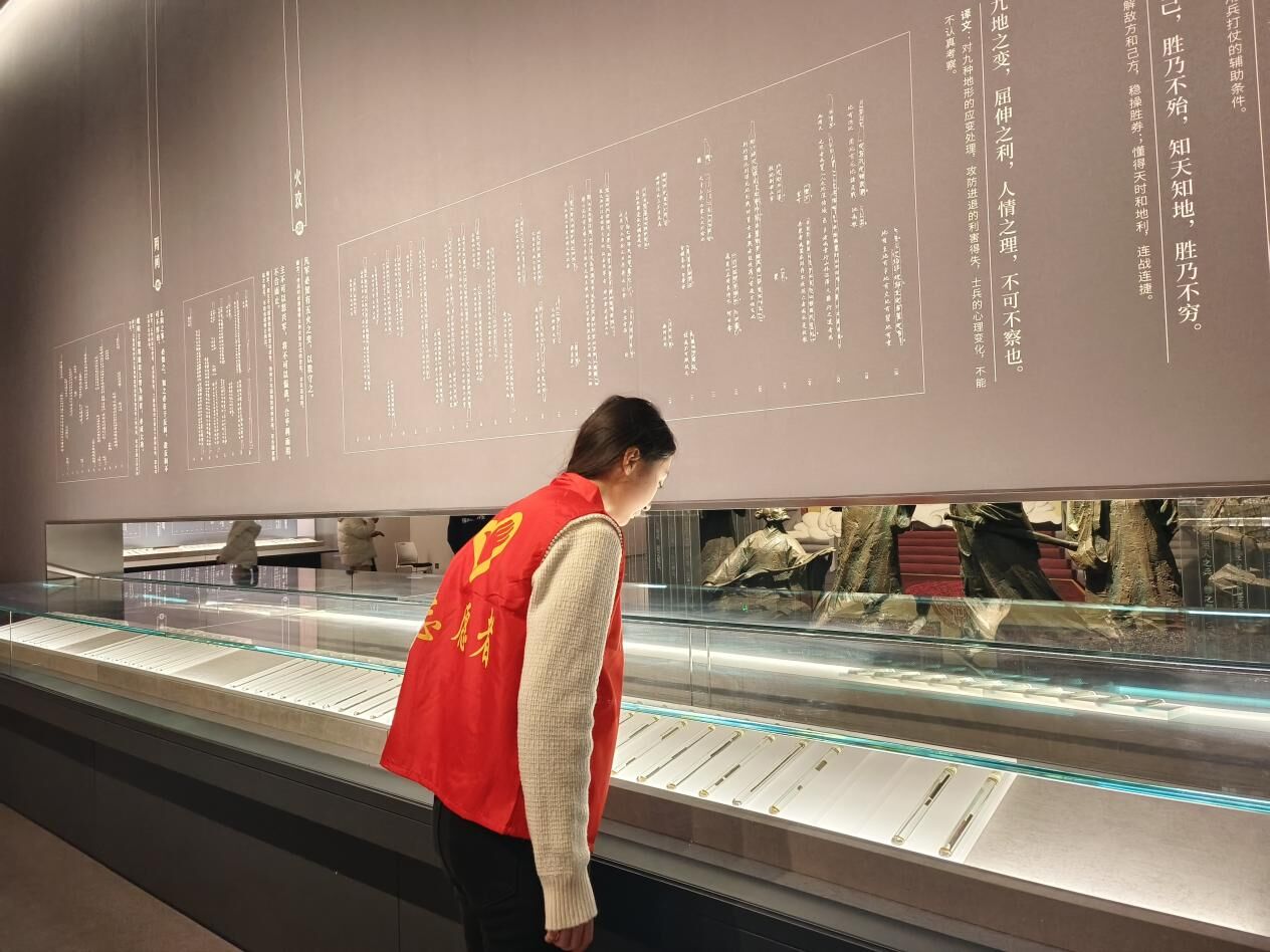 在“武经冠冕”展馆,队员们看到了《孙子兵法》的实物陈列。这些竹简虽然历经千年,但依然保存完好,字迹清晰可辨。通过展板上的介绍,队员们了解到,《孙子兵法》以其深邃的军事思想和精妙的战略战术,被誉为“兵学圣典”。队员们又借助多媒体展示,对《孙子兵法》中的经典语句进行解读,更直观、更清晰地理解其中的智慧与价值。