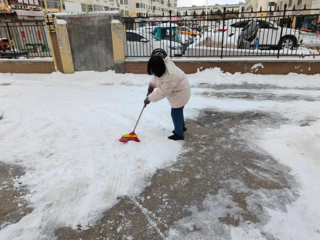 实践队员根据路面状况灵活运用多种工具开展作业:针对单元门台阶、人行道砖缝等易滑区域,使用小型除冰铲精细破除顽固冰层;对主干道及广场等大面积积雪区,采用大号雪铲集中清理压实雪块;同步配合扫帚清扫残余碎雪,并在坡道、盲道等关键位置铺设防滑垫。作业过程中,实践队员积极配合物业工作,与相关工作人员及其他志愿者按楼区划分责任区,采取分组轮换、人机配合等方式提升效率,重点保障老年人、儿童活动场所及机动车通道畅通。尽管寒风刺骨,但实践队员干劲十足,忙碌的身影成为冬日里的一抹亮色。