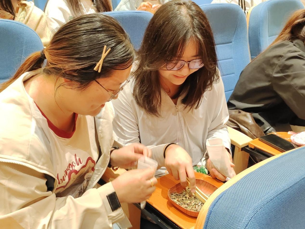 活动现场摆满了艾叶、藿香、苏叶等中药材,以及香囊布料、丝线等材料。同学们在演示同学的指导下,先将药材按比例混合,然后再装进精美的香囊袋中,最后用丝线收口,驱蚊香囊很快就制作完成。 这些驱蚊香囊不仅外形美观,还具有天然的驱蚊功效。
