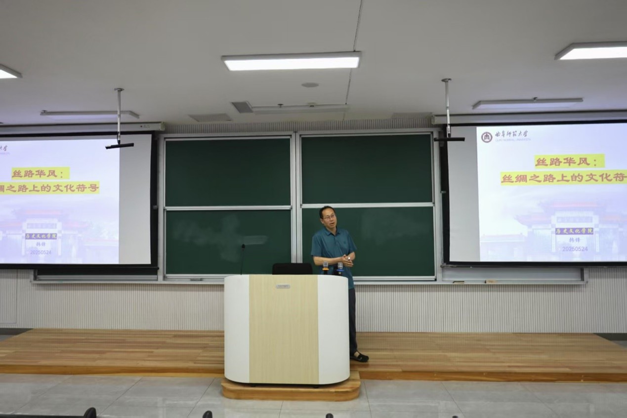 讲座伊始,韩锋老师强调,丝绸之路不仅是一条贸易通道,更是东西方文化交流融合的桥梁,丝绸之路上的文化符号承载着丰富的历史内涵,对于理解中华文明的开放性与包容性、增强文化自信具有重要意义。随后,韩锋老师以渊博的学识、生动的语言,从丝绸之路的起源讲起,沿着历史的脉络,深入剖析了丝绸、瓷器、佛教艺术、音乐舞蹈等极具代表性的文化符号。韩锋老师结合当下“一带一路”倡议,阐述了挖掘和传承丝绸之路上文化符号的现代价值,探讨了如何通过这些文化符号增进国际间的文化交流与理解。