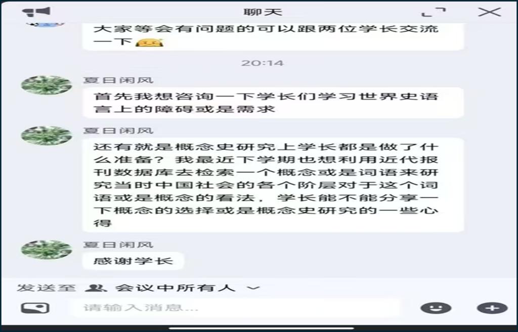 活动共分为三个阶段。准备阶段,社团提前向社联报备,预定线上会议,并精心筹备相关内容;活动进行中,两位分享人热情分享学术经历,分享结束后与社员展开答疑交流,同时相关人员做好活动记录;活动结束阶段,有序安排参与人员离场,并对活动进行全面总结。活动现场,两位分享人不仅分享了丰富的学术经验分享,还提供了由浅入深的冷战史领域书单,为同学们了解学界动态、汲取学习经验、建立研究兴趣提供了有力支持。此外,工作人员提前入场准备,活动设施完备,流程安排合理,PPT制作精美、内容充实,用词精准,学术交流环节参与度高,现场气氛和谐融洽。