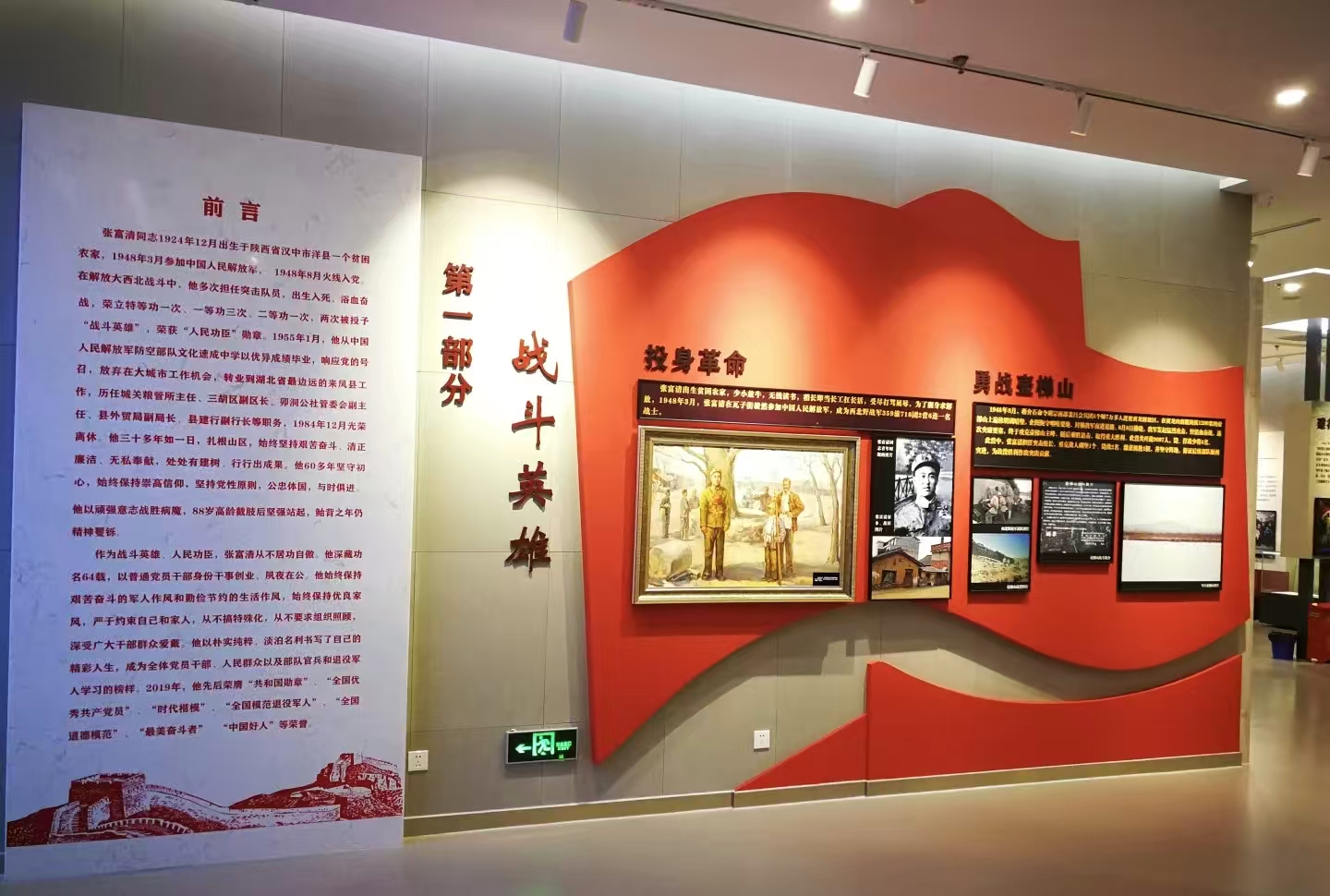 踏入展馆,首先映入实践队员眼帘的是“战斗英雄”板块。前言部分详细介绍了张富清的生平。他于1924年12月出生在陕西汉中的普通农家,在1948年3月投身革命,同年8月火线入党。在解放大西北的战斗中,他多次担任突击队员,冲锋陷阵,出生入死。“投身革命”“勇战壶梯山”等展示区域,通过珍贵的历史照片、生动的油画以及详细的文字说明,再现了那段战火纷飞的岁月。实践队员们围聚在展板前,认真记录下张富清荣立特等功一次、一等功三次、二等功一次,荣获“战斗英雄”“人民功臣”等荣誉的光辉事迹,眼神中满是对英雄的敬佩。