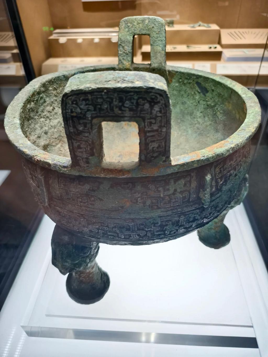 监鼎通高 21.2 厘米,方唇折沿、腹微鼓,分裆三柱足的设计尤为独特。器腹被巧妙分割为三部分,连接处形似裤裆,这种 “分裆鼎” 融合了鼎的礼器属性与鬲的炊煮功能,是商周鼎器的重要类型。双立耳外撇、柱足饰蝉纹,整体造型在规整中透着不容置疑的威严。而最令人震撼的,当属其高浮雕兽面纹工艺:腹部以分裆处为界,三组兽面纹 “角外卷、圆目鼓凸、大耳獠牙”,角、眉、耳等部位以高浮雕凸起,周围衬以细密云雷纹填地。队员们仔细观察发现,工匠先在范模上雕刻出兽面的立体轮廓,再以回旋线条的云雷纹铺底,通过 “浮雕 + 地纹” 的层次对比,让兽面仿佛从青铜表面 “跃出”,生动诠释了商周青铜器特有的 “神秘狞厉美”。