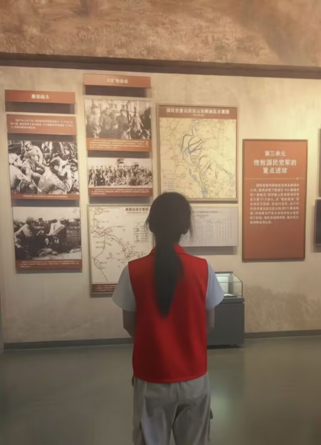 踏入纪念馆大门,厚重的历史气息扑面而来。序厅内,一尊高约三米的华东野战军战士群雕赫然矗立,战士们眼神坚毅、身姿挺拔,仿佛正奔赴硝烟弥漫的战场,瞬间将队员们的思绪拉回了那个战火纷飞的年代。展厅内灯光柔和而庄重,玻璃展柜中陈列的每一件文物都承载着岁月的印记:泛黄的战地日记里,工整的字迹记录着战士们对胜利的渴望与对家国的深情;锈迹斑斑的步枪上,凹凸的纹路诉说着曾经的枪林弹雨;磨损的军号虽已沉默,却仿佛仍能听见它在战场上激昂的冲锋声。这些珍贵的文物与详实的史料记载相互印证,为队员们铺展开一幅生动的历史长卷。