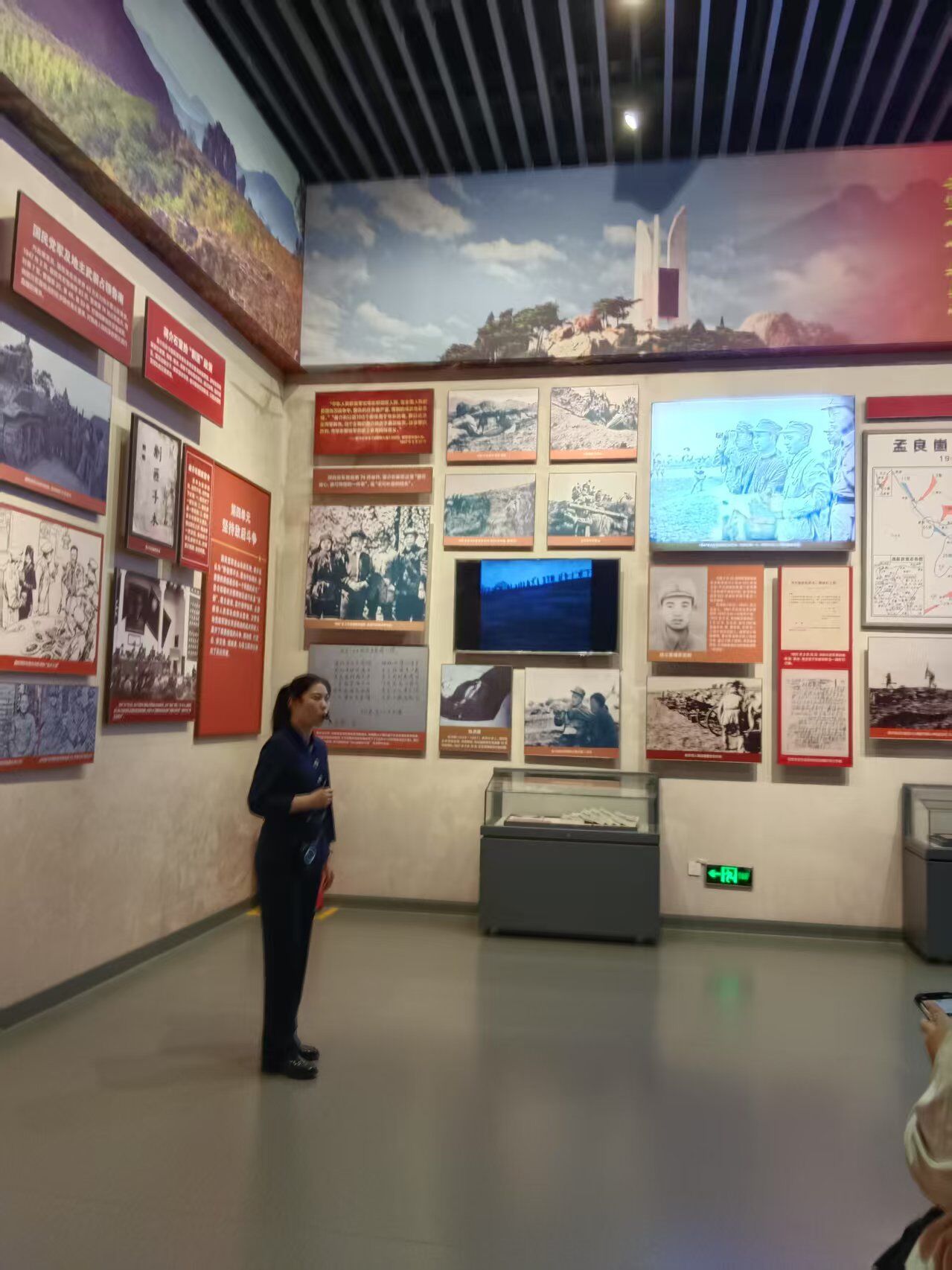 除了静态展览,纪念馆还通过多媒体演示、场景复原等现代化展陈方式,让历史“活”了起来。在“战地医院”复原场景中,昏暗的油灯下,医护人员正在紧张地为伤员包扎伤口,逼真的场景布置搭配轻柔的背景音乐,让队员们仿佛置身其中,真切感受到战争的残酷与医护人员的无私奉献。而在战役模拟场景前,随着灯光暗下,环绕式屏幕亮起,枪炮声、呐喊声骤然响起,硝烟特效缓缓弥漫,队员们仿佛穿越时空,置身于激烈的战斗现场。