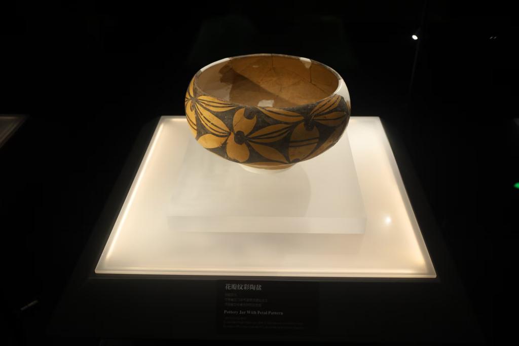最后,谈到展览主题“花开中国”的内涵,讲解员分别从庙底沟彩陶的“花瓣纹”、严文明先生的“重瓣花朵”理论等方面入手,进行了详细解读,并谈到了其与中华文明起源的密切联系:“在严文明老师的重瓣花朵理论中,中原文化区,也就是庙底沟遗址所在的位置被视为花心,周围的其他文化组成多重花瓣,这样稳定的重瓣花朵式格局,就形成于庙底沟文化时期。‘中国’的‘中’字所蕴含的文化意义,在这一时期已经初露峥嵘”。