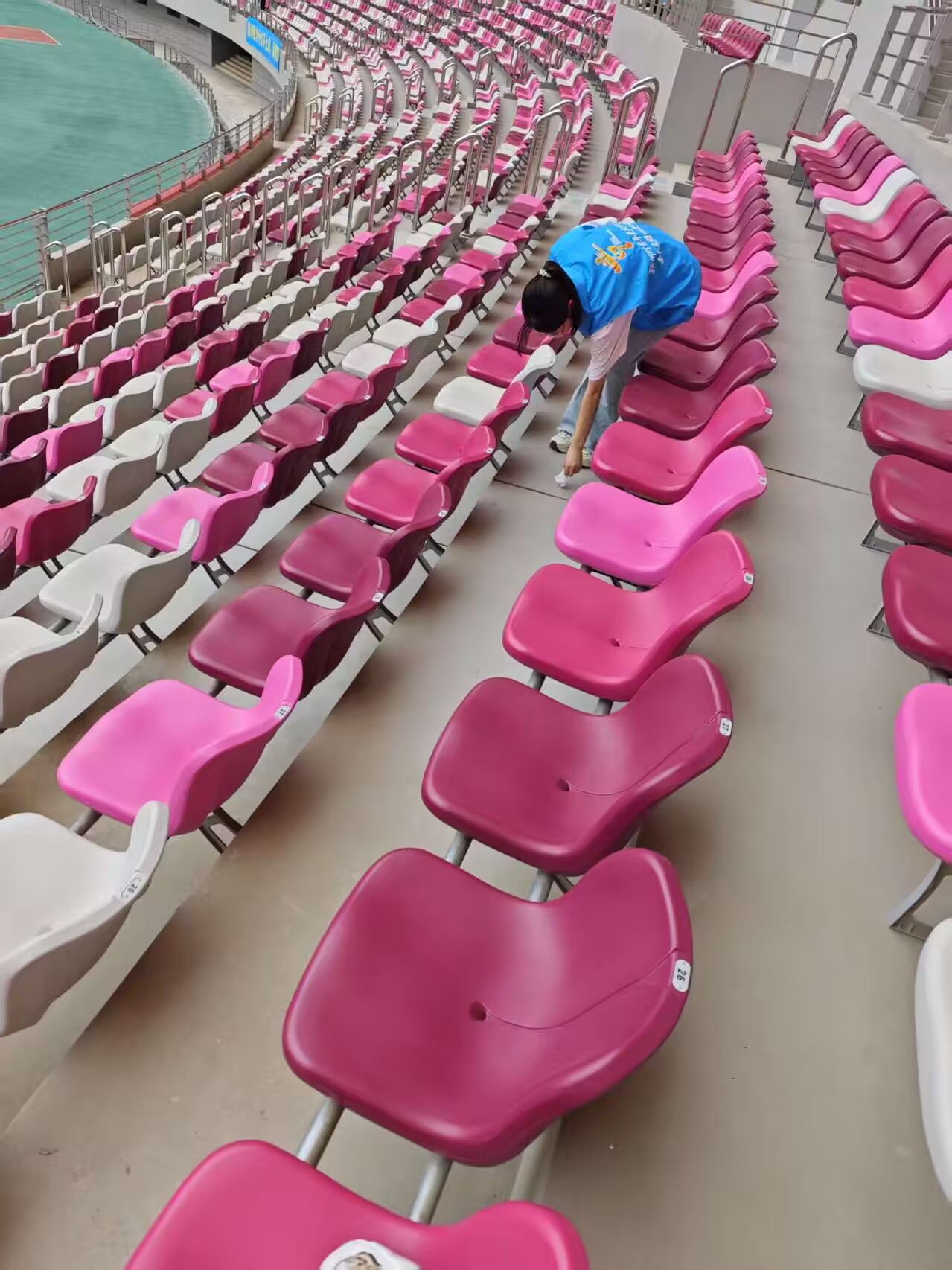 队员们弯腰穿梭在座椅之间,对每一个角落进行排查。有的蹲下身捡拾卡在座椅缝隙里的纸屑,有的踮起脚够取高处平台上的空瓶,还有的负责将装满的垃圾袋集中搬运到指定回收点。面对散落的垃圾,他们没有丝毫懈怠,分工明确、配合默契,从看台前排到后排,从低层到高层,确保不放过任何一处卫生死角。