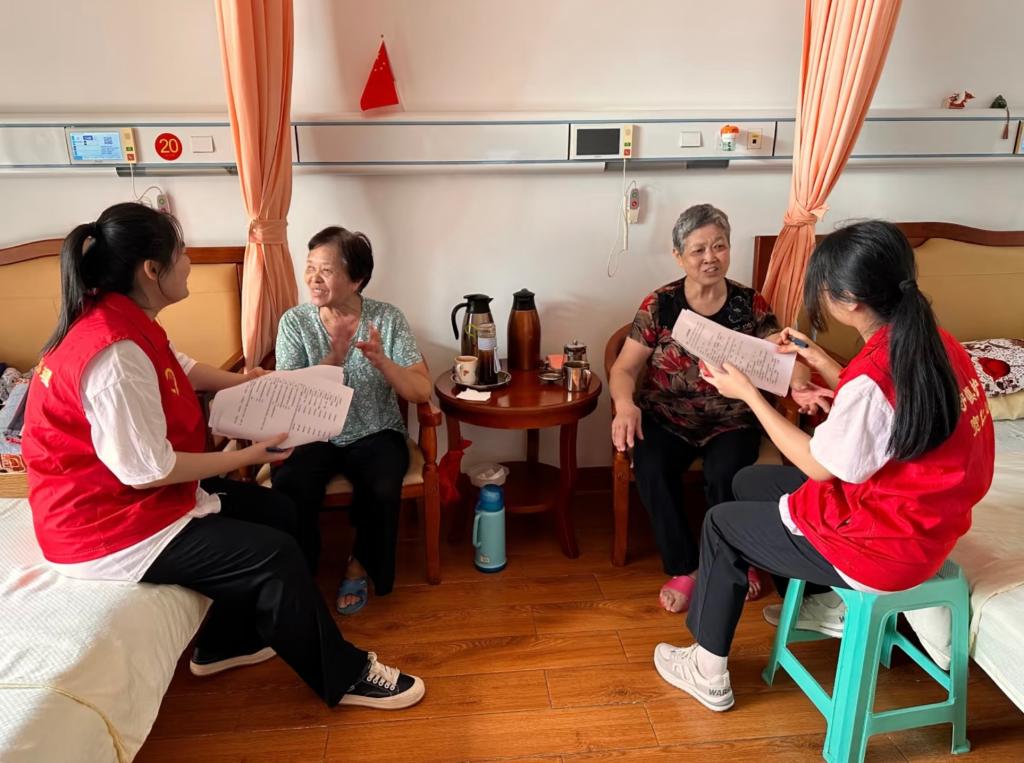 早上社会实践队达到养老院,大部分老人刚刚吃过早饭。为了更好地进入今日的实践主题,队员们分工协作,一人推着一个老人,带着老人感受清晨阳光的温暖。队员吕佳慧一边推着轮椅,一边指着沿途的消防栓科普:“奶奶,您看红色消防栓,就像防诈骗的‘安全阀’,关键时刻拧一下,骗子就进不来。”老人笑着点头:“今天你们就是我的安全阀!”