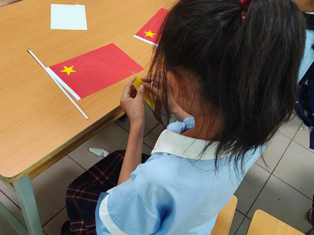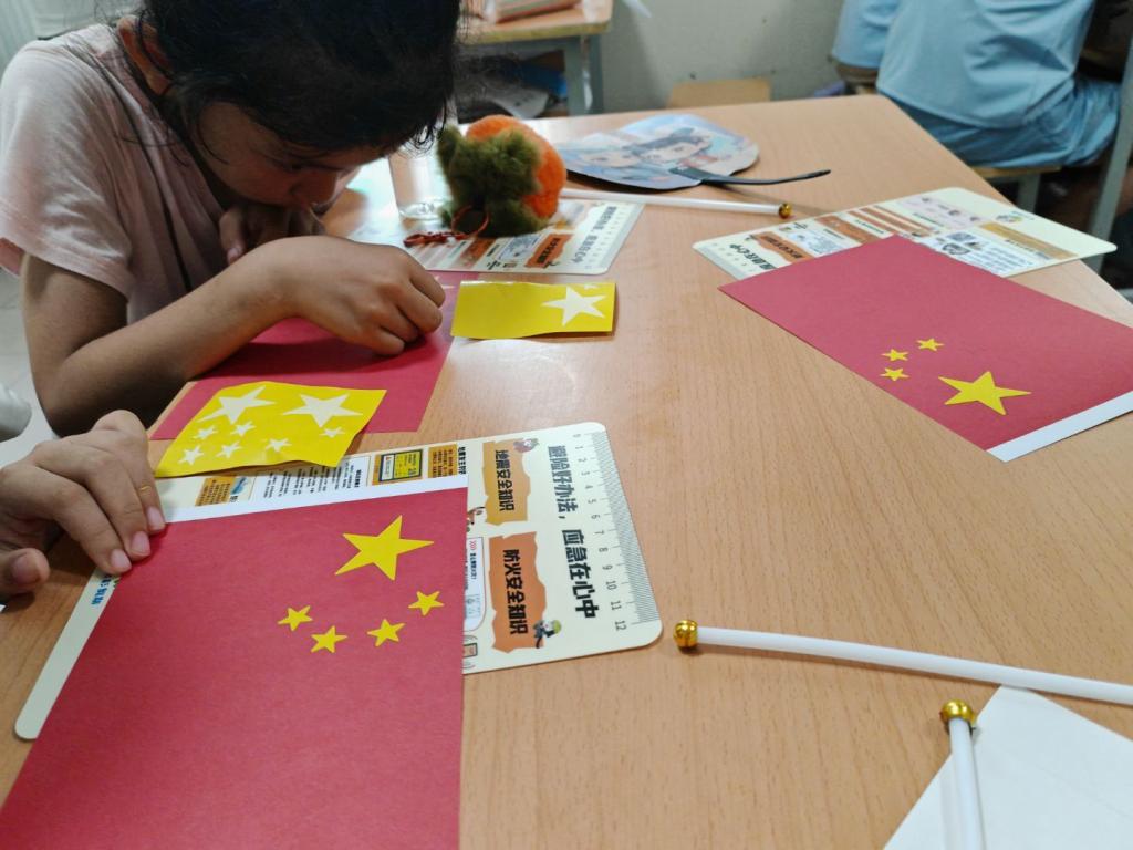 在国旗手作环节,同学们全部聚精会神地制作国旗。他们用剪刀小心翼翼地按照提前画好的五角星形状裁剪出来,在背面均匀涂抹胶水后粘贴在与国旗同比例的红色卡纸上,还原国旗的旗面。然后用胶带把提前准备好的小旗杆与国旗组装在一起,就制作出了简单的手持国旗。制作结束后,一名小学生举着手工国旗说:“我要把它挂在书桌前,提醒自己为祖国而读书。”