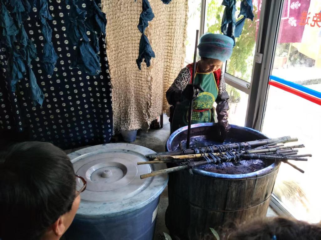 扎结完毕,实践队成员依次按照指导老师所说将自己的扎染布料浸入清水润湿,随即投入染缸。双手轻压,使布团在染液中起伏沉浮,充分浸润。靛蓝分子悄然渗入未被束缚的纤维间隙。据当地扎染老师说,扎染的颜料一般为蓝色,多用一味耳熟能详的中药——板蓝根为染缸原料。布料在充分浸润后在氧化作用下颜色会逐渐加深变化:由黄绿色,氧化为靛蓝。布料颜色的深浅与染缸中板蓝根浓度和后期氧化程度有着密不可分的关系。在等待的过程中当地扎染师傅便为实践队成员详细介绍道:“本地扎染多使用棉白布或棉麻混纺白布,主要染料来自苍山上生长的板蓝根、艾蒿等天然植物的蓝靛溶液,尤其是板蓝根。而以前用来染布的板蓝根都是山上野生的,后来用量大了,大家就在山上自己种植,好的能长到半人高,收割下来之泡出水,注到木制的大染缸里,掺一些石灰或工业碱,就可以用来染布。”扎染师傅讲的深入浅出,实践队成员听得津津有味。