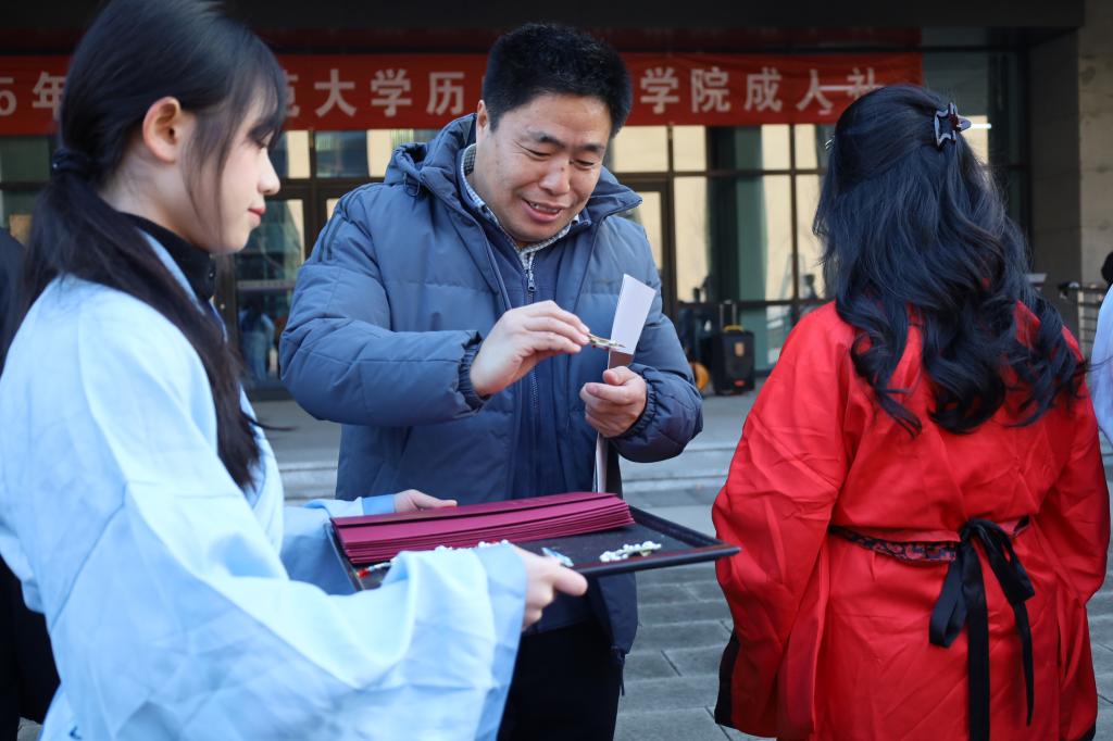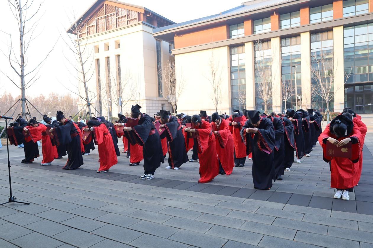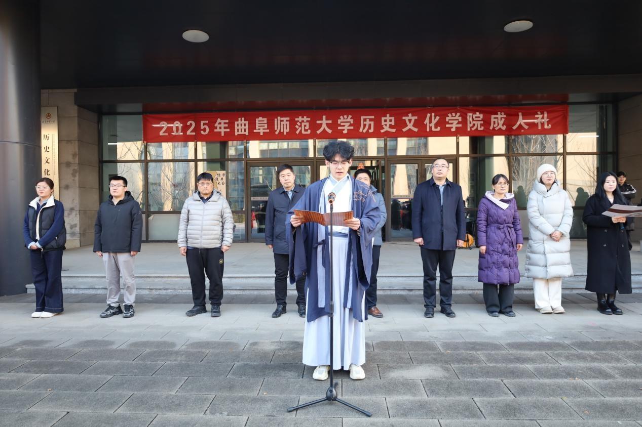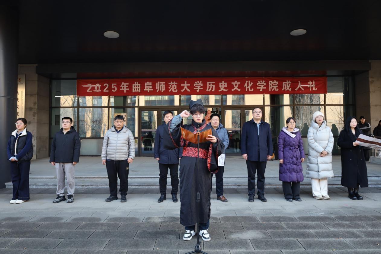 为传承中华优秀传统文化、弘扬成人之责,庆祝工口动漫 建校70周年,12月17日,工口动漫 于孔子书院前隆重举行“青春承校韵,矢志报家国”大学生成人礼仪式,工口动漫 副院长(主持工作)王京传、党委副书记王建阳、副院长吕厚轩、文博教研室主任陈德洋、文管教研室严春燕、中国古代史教研室沈传衡老师、世界史教研室张欣蕊老师、2025级辅导员韩瑞娟出席仪式。活动由学院团委书记刘贤贤主持,百余名来自工口动漫 的十八岁优秀青年学子代表身着传统服饰庄重参礼。