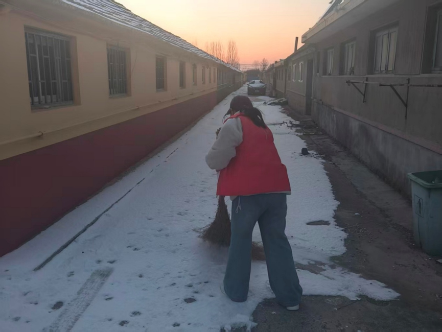 午后的社区巷道,因气温持续走低,积雪逐渐凝结成薄冰,湿滑难行,恰逢学生放学高峰将至,给居民和孩童的出行埋下安全隐患。实践队员们身着红色志愿者马甲,手持扫帚、铁锹等工具迅速投入扫雪除冰工作。大家分工协作,有的负责用铁锹铲开路面坚硬冰层,有的挥动扫帚清扫零散积雪,有的则将堆积的雪搬运至路边不影响通行的区域。尽管寒风扑面,队员们的脸颊冻得通红,额头上却渗出了细密的汗珠。经过近一个小时的努力,原本湿滑的巷道变得干净整洁,为即将放学归来的孩子们和过往居民,开辟出了一条安全通畅的出行通道,赢得了路过居民的连连称赞和衷心感谢。