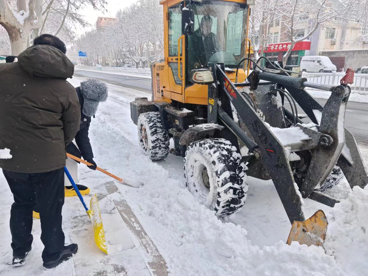清雪现场,呈现出“机械+人力”协同作战的高效场景。一辆社区物业的黄色大型装载机轰鸣作响,负责铲除主干道上的厚重积雪。紧随其后,身着志愿服务马甲的队员们则利用工具,对机械作业后的残余冰雪及人行道等狭窄区域进行精细化清理。大家挥动铁锹雪铲,破开冰层,将积雪推至路边。