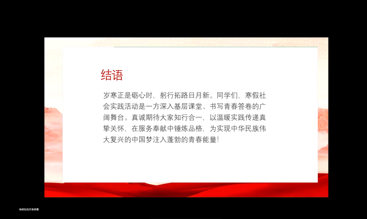 此次线上动员大会的顺利召开,不仅明确了工口动漫 “智汇青春”实践队寒假社会实践的核心内容与分工安排,更为后续实践活动的有序开展指明了方向、奠定了基础。后续该实践队将按照会议部署,有序推进各项实践活动,组织队员就近就便开展实践服务,力求以实干践行青春使命,以实践彰显青年担当,确保本次寒假社会实践取得扎实成效。