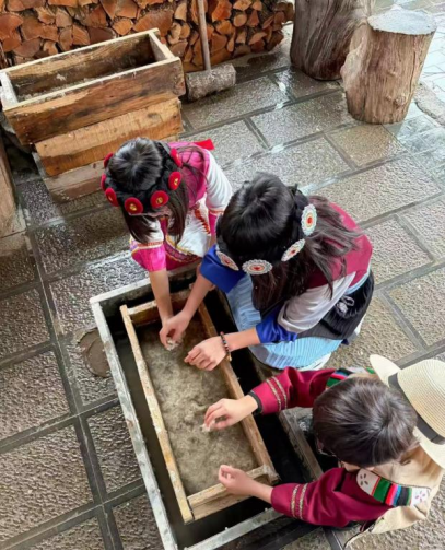 为进一步在社区青少年中播撒文化传承的种子,实践队员们特别为社区儿童组织了东巴造纸术体验环节。东巴纸因其耐久、防蛀的特性,千百年来用于书写东巴经文,被誉为“活化石”纸张。在事先学习和准备的基础上,队员们化身为“小老师”,向孩子们简要介绍东巴纸的历史与价值,并演示古法造纸的关键步骤:从纸浆搅拌、抄纸、压水到自然晾干。孩子们在队员们的协助下,兴致盎然地亲手操作,将纸浆均匀铺展在纱网上,看着水滤去,初步的纸膜渐渐成形。现场充满欢声笑语,孩子们对自己的劳动成果爱不释手。这一体验不仅让孩子们直观感受到了古老造纸术的神奇,更在他们心中埋下了保护与传承非物质文化遗产的初步意识。