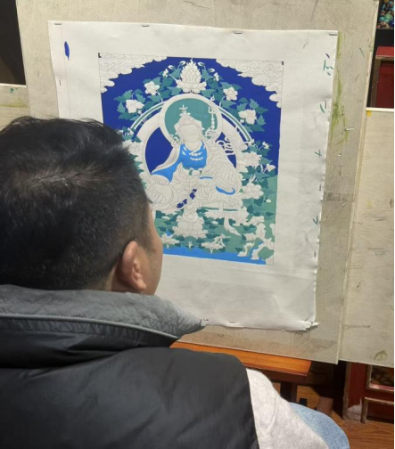 唐卡作为藏族文化的瑰宝,以其精湛的绘画技艺、浓郁的宗教色彩和独特的艺术风格,承载着深厚的民族文化与信仰内涵。1月28日上午,实践队队员早早抵达北门社区文化站,与社区工作人员一同布置充满民族风情的活动场地。现场悬挂着展示藏族文化与丽江风情的图片,营造出宁静而庄重的氛围。活动正式开始后,实践队员们首先在非遗传承人的指导下,亲身学习唐卡绘画的基础技艺。传承人细致讲解了唐卡的起源、象征意义以及绘制所用的天然矿物颜料特性。队员们认真聆听,随后小心翼翼地在特制画布上尝试勾勒线条、填充色彩,沉浸于笔尖流转间的宁静与专注。这一过程不仅让队员们深刻体会到唐卡艺术的严谨与神圣,也为后续向社区居民介绍这一艺术形式积累了直观经验。