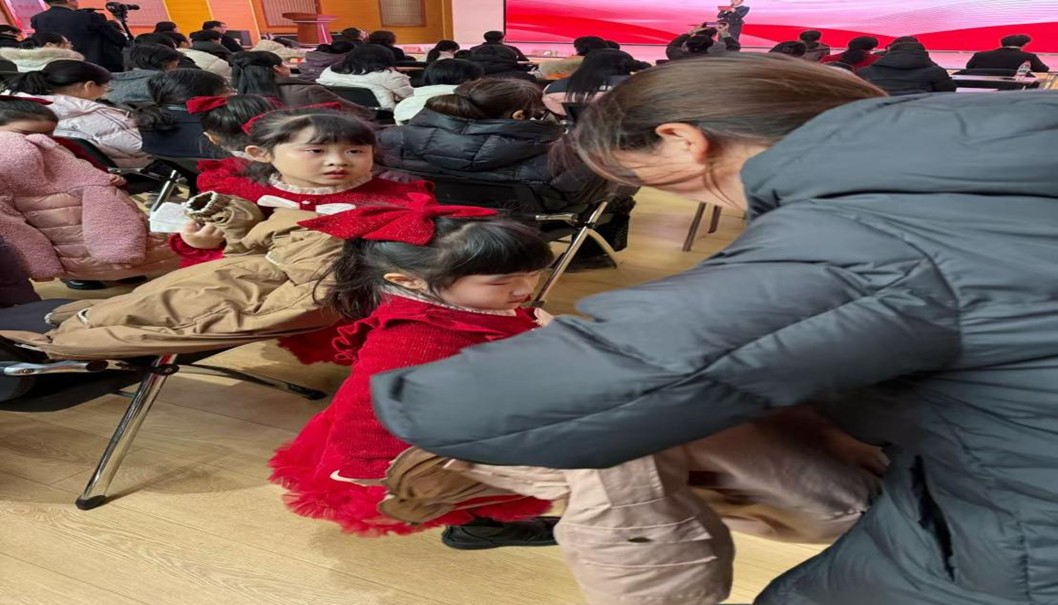 活动筹备阶段,实践队员深入会场开展服务工作,用细致举措传递温暖。在会场座椅区,一名身着红色演出服的困境儿童因衣物单薄面露怯意,实践队员立即上前,蹲身为其披上保暖外套,细致整理衣领与裙摆,同时以温和的方式安抚其情绪,帮助孩子快速适应现场环境。这一暖心举动,是实践队员践行 “精准服务、细节暖心” 理念的缩影,现场诸多此类细节,让困境儿童在陌生环境中感受到切实关怀。除了一对一的陪伴帮扶,实践队员们还分工完成演出道具整理、会场引导、物资摆放等工作,以高效协作保障活动筹备工作落地。