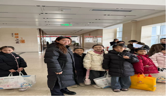 活动间隙,实践队员与参与活动的困境儿童在中心走廊合影留念。画面中,实践队员身着深色保暖外套,与身着各色冬装、手提爱心物资袋的孩子们并肩站立,孩子们的笑容真挚灿烂,实践队员的神情温暖坚定,定格下青春力量与童真成长的双向奔赴瞬间。合影前,实践队员们与孩子们简单交流,了解其学习生活近况,倾听孩子们的心愿,为后续优化关爱服务积累第一手资料,也让陪伴的意义超越活动本身,成为连接高校与困境儿童群体的情感纽带。
