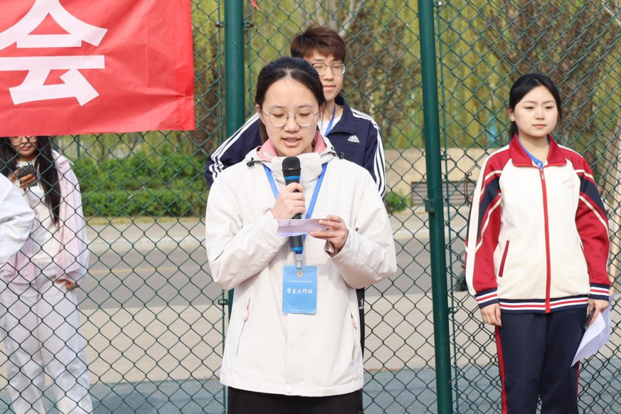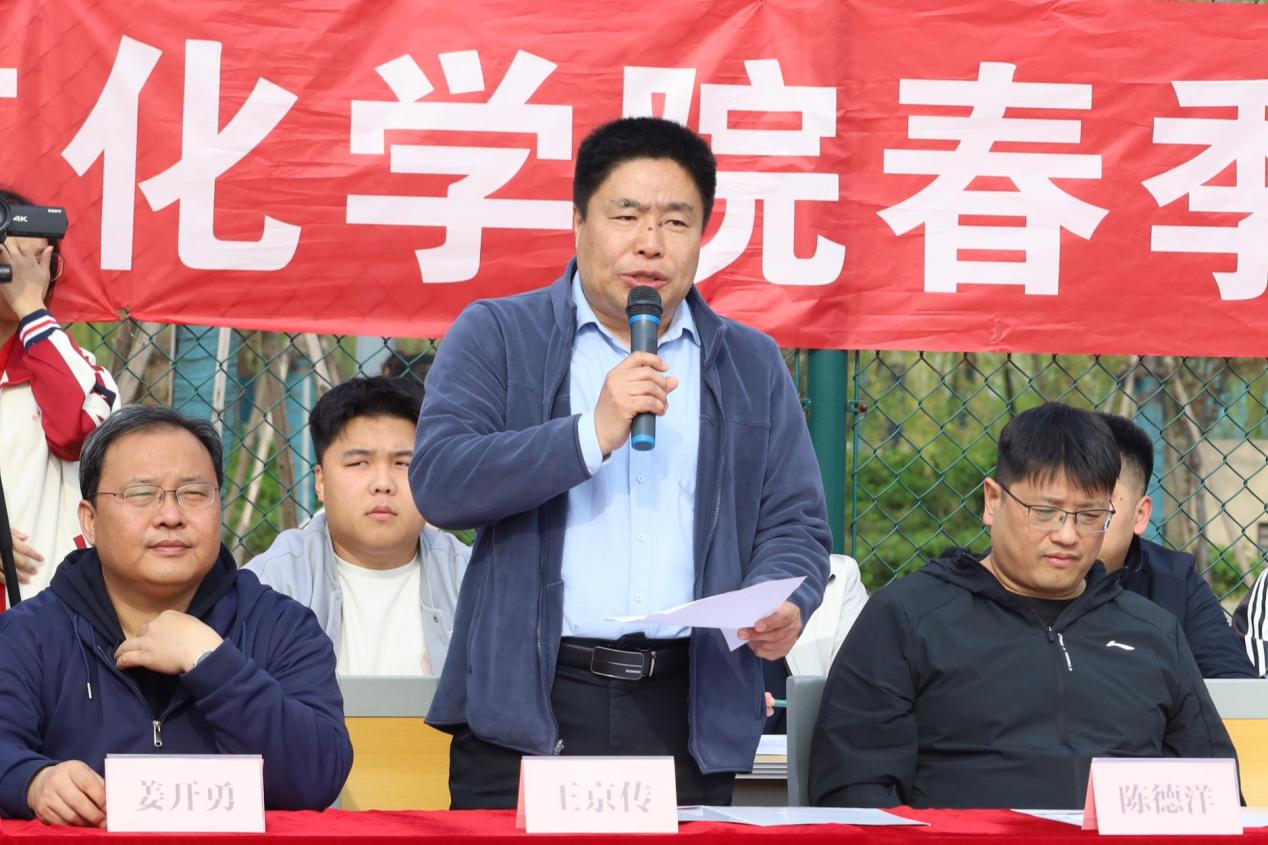 开幕式上,王京传发表开幕讲话,首先对本次春季运动会的顺利举办表示热烈祝贺,向积极参与的全体运动员、坚守岗位的裁判员及到场观赛的师生们致以亲切问候,同时寄语全体人员既要享受运动乐趣,也要奋勇拼搏,并预祝本次运动会取得圆满成功。陈德洋致辞,代表学院工会向为运动会筹备付出辛勤努力的师生们表示衷心感谢,鼓励运动员们以饱满热情投入比赛,在赛场上赛出风格、赛出水平,同时强调需注意安全、严格遵守赛事规则。2024级孙宁慧、李子恒分别代表运动员与裁判员登台表态,庄严宣誓将严格遵守赛事规程,恪守体育公平公正原则,坚守职业操守与体育道德,全力保障赛事有序推进、圆满完成。