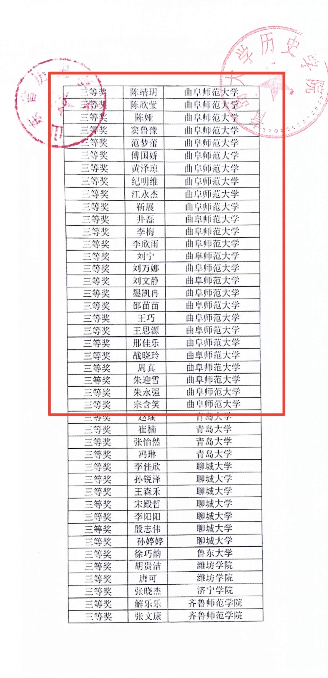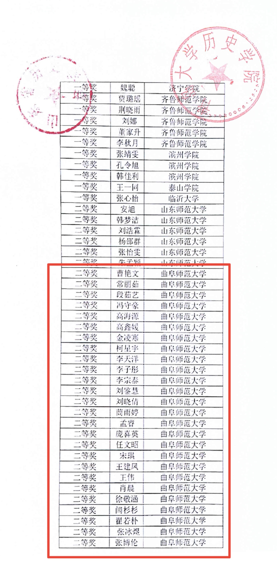 据悉,第二届山东省大学生历史征文大赛由山东省历史学会主办,青岛大学历史学院承办,以“中外历史”、“考古学”、“齐鲁历史文化”、“民俗文化”等为主题,面向驻鲁高校历史学专业本科生。本次大赛持续秉承提升历史专业大学生创新意识与研究能力的宗旨。参赛论文由山东省历史学会专家评审小组按照“质量优先,公平公开”的要求进行综合考虑,统一评审。
