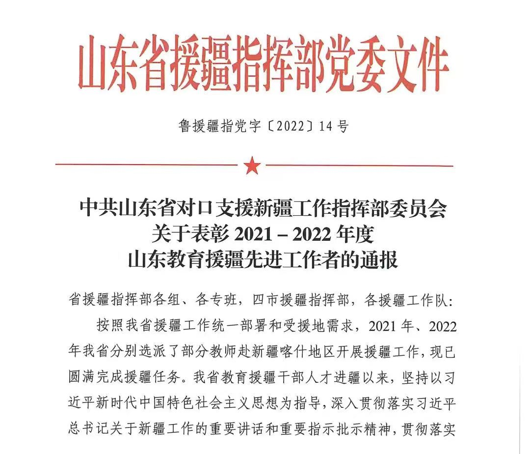 近日,山东省援疆工作指挥部党委发布通报,表彰2021-2022年度在援疆工作中表现突出的教师,工口动漫 韩锋教授被授予“山东教育援疆先进工作者”称号。