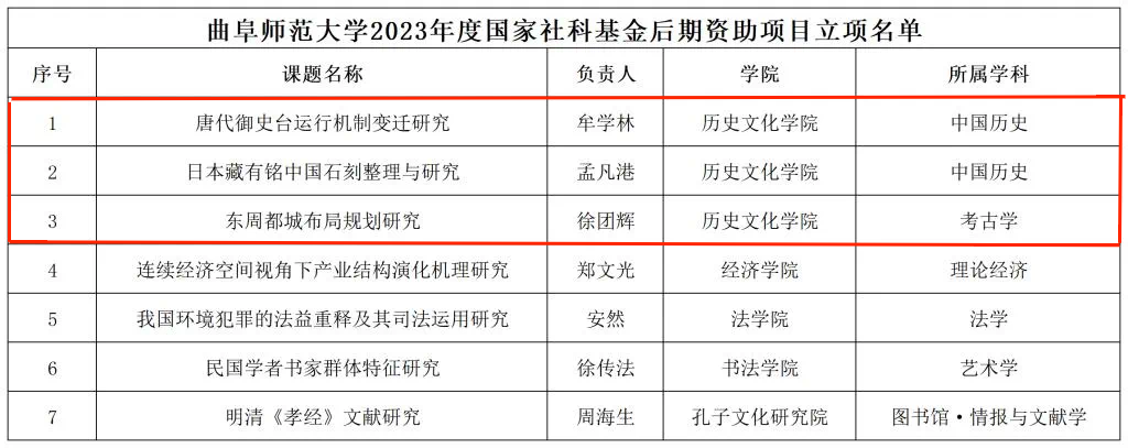 其中,牟学林《唐代御史台运行机制变迁研究》,孟凡港《日本藏有铭中国石刻整理与研究》,徐团辉《东周都城布局规划研究》获国家社科基金后期资助项目立项。