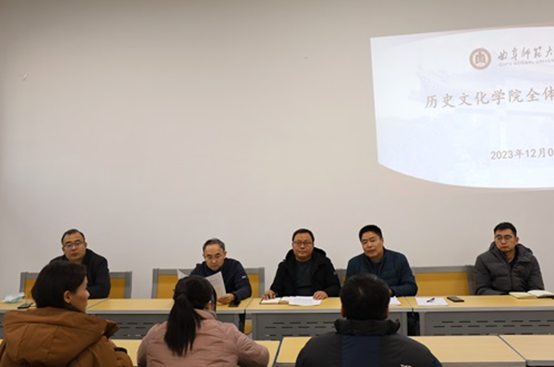 会上,副院长王京传就下一阶段本科教育教学审核评估工作和本科生教学有关事宜进行了安排部署。张世慧老师就研究生的论文开题、预答辩等工作进行了汇报。党委书记姜开勇首先传达了学校意识形态和宣传思想工作领导小组会议精神,并对近期意识形态领域的形势和风险进行了分析和预警,他还就师德师风、安全稳定、信息采集、年度考核等工作进行了强调和部署。院长吴佩林传达了学校本科教育教学审核评估专家线下评估推进会会议精神,强调了教师的日常考勤和课堂要求等问题,并就下一年度社科基金的申报工作进行了安排部署。最后,参加2023年度职称评审的教师依次进行了述职,并进行了民主测评。