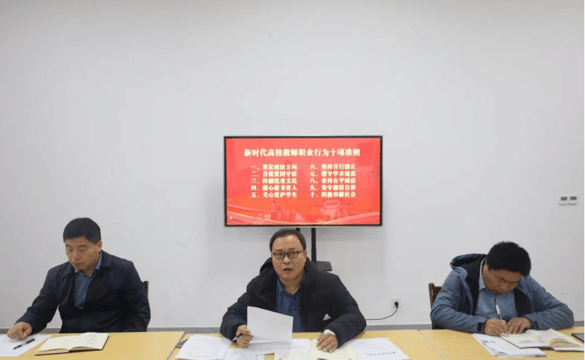 会议伊始,学院开展教职工政治理论学习和师德师风专题教育,姜开勇带领全体教职工逐条重新学习了《新时代高校教师职业行为十项准则》,并通报了有关师德失范的警示案例。随后,吕厚轩通报了工口动漫 近期研究生培养的相关工作,传达了我校《2025年研究生招生计划分配方案》与《研究生指导教师资格认定与管理办法》的通知等文件,并就研究生中期考核等工作进行了安排部署。王京传对学院近期的教学、科研等有关工作进行通报,传达了《山东省教育厅等5部门关于推进师范教育高质量发展的若干措施》和我校《加强教授、副教授为本科生授课的管理办法》等通知文件以及学校有关会议精神,并就课堂意识形态问题、手机入袋政策、缺课追踪、科研立项、高质量发展等工作进行安排部署。最后,姜开勇传达了学校10月21日的工作会议精神,带领全体教职工学习了我校最新下发的《教职工考勤管理办法(试行)》和《关于建设清廉学校的实施方案》等文件,并就近期的安全工作、意识形态、宣传工作、师德师风、学生管理等各方面工作进行了安排部署,提出了明确要求。