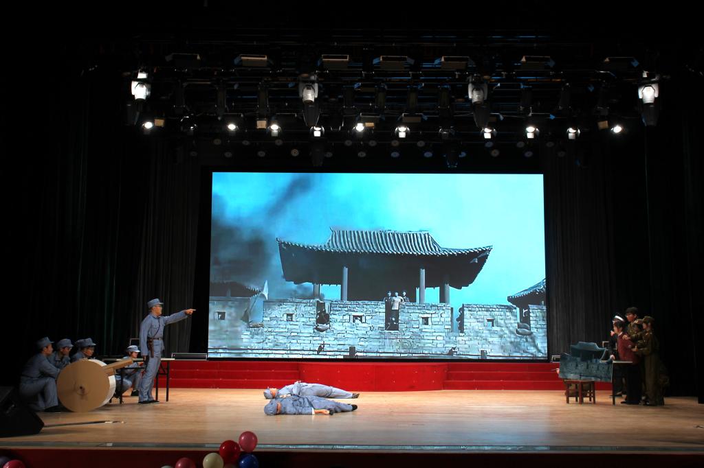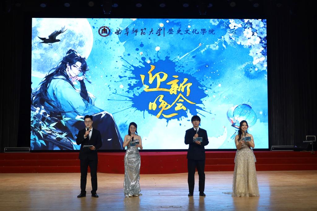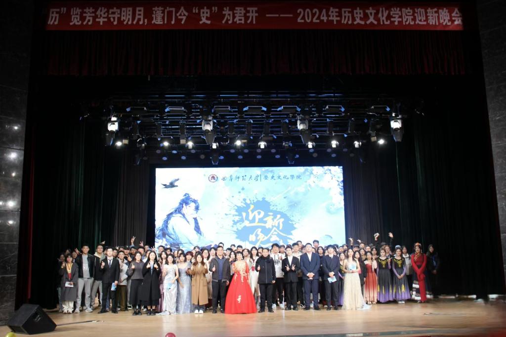 本次晚会内容丰富,形式多样。晚会在一段充满活力的视频中缓缓开幕,视频记录了2024级新生的美好瞬间,展现了新生们对大学生活充满向往的奋发面貌。在激情四射的开场舞调动起全场的热情后,晚会正式开始。随后进入第一幕“历”耕杏坛,小品《先生请出山》带我们再次回顾了“三顾茅庐”的历史,领略到古人的智慧与坚持。张松伟老师献唱的歌曲《祝福祖国》让所有人在悠扬的歌声中加深了对祖国母亲的爱。在第二幕踔“历”奋发中,话剧《亮剑》以生动传神的表演再现了先辈为革命胜利而奋斗的坎坷与决心。相声《礼仪漫谈》让大家在欢乐的氛围中增进了对礼仪文化的认识。第三幕砥“历”前行,歌曲串烧的表演者们声情并茂,各展风采,展现了大学生的青春活力与无限创造力,为我们带来一场精彩的视听盛宴。最后,师生合唱《我爱你中国》,昭示本次迎新晚会的圆满落幕。晚会结束后,演职人员上台合影留念。