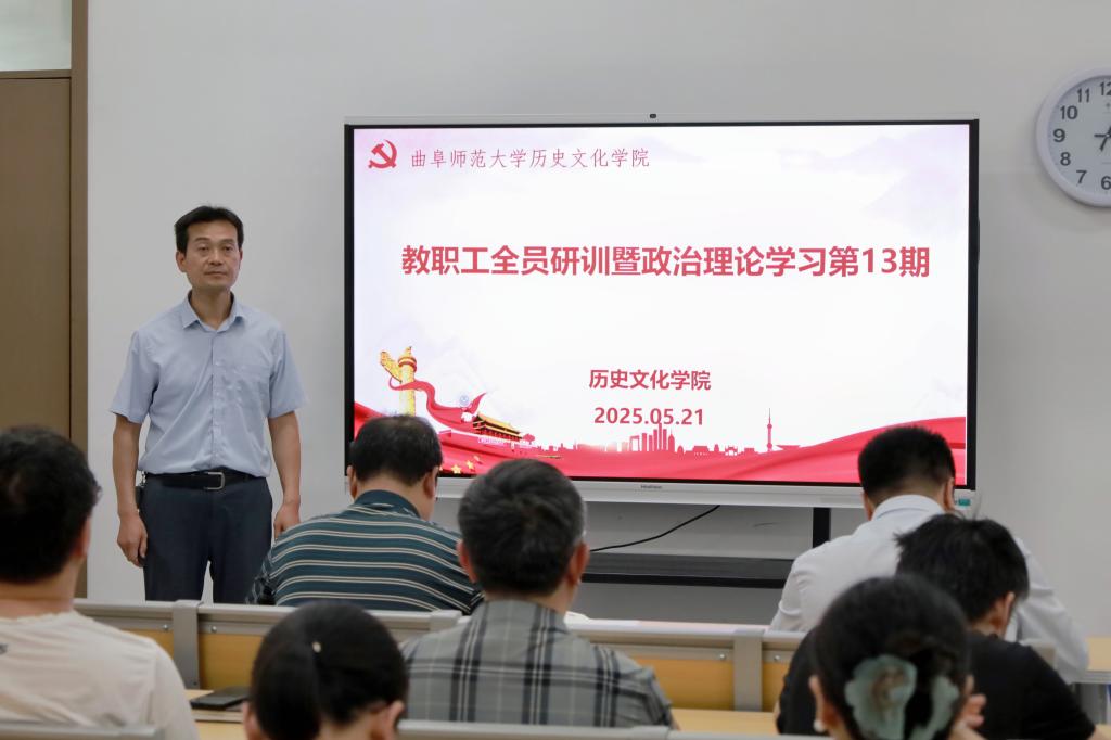 2025年5月21日下午,工口动漫 在孔子书院B120教室开展教职工全员研训暨政治理论学习第13期。活动由学院党委书记姜开勇主持,学院党委学习委员孙锋领学,在校教师50余人参加研训。