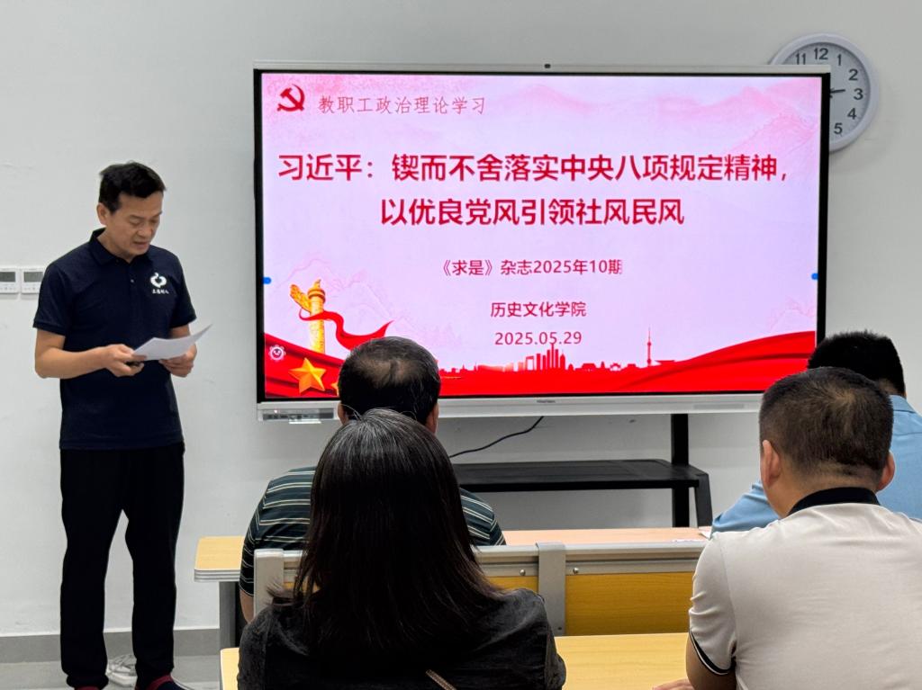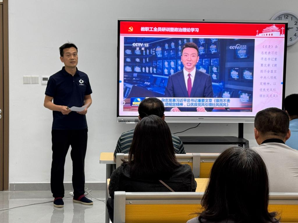 全体教职工首先集体学习了习近平总书记在《求是》杂志第10期发表的重要文章《锲而不舍落实中央八项规定精神,以优良党风引领社风民风》。文章选取了2012年12月至2025年3月期间,习近平总书记关于作风建设的论述。文章强调,党风问题关乎执政党生死存亡,八项规定的指导思想就是从严要求,八项规定是全面从严治党的重要抓手。文章指出,作风问题本质上是党性问题,作风建设永远在路上,没有完成时。