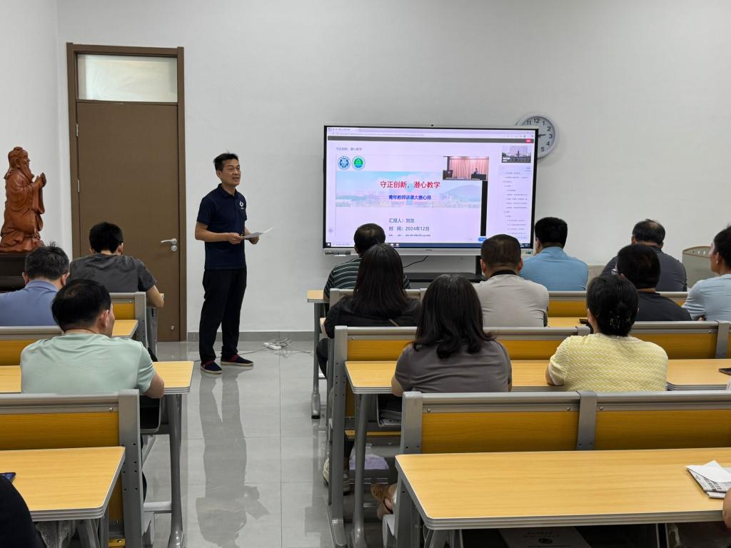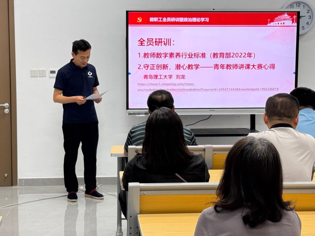最后,全体教职工集中观看了由青岛理工大学环境学院副院长刘龙教授主讲的《守正创新,潜心教学——青年教师讲课大赛心得》。刘龙教授从平时教学与青教赛的区别引入,以青教赛的评分标准为基础系统梳理了青教赛备赛的底层逻辑,并分享了备赛中的个人心得。报告明确针对青年教师教学比赛备赛实操各环节和教学能力提升的系统理念,既有思想引领,也有方法指导。在场教师都表示收获满满、感悟良多。