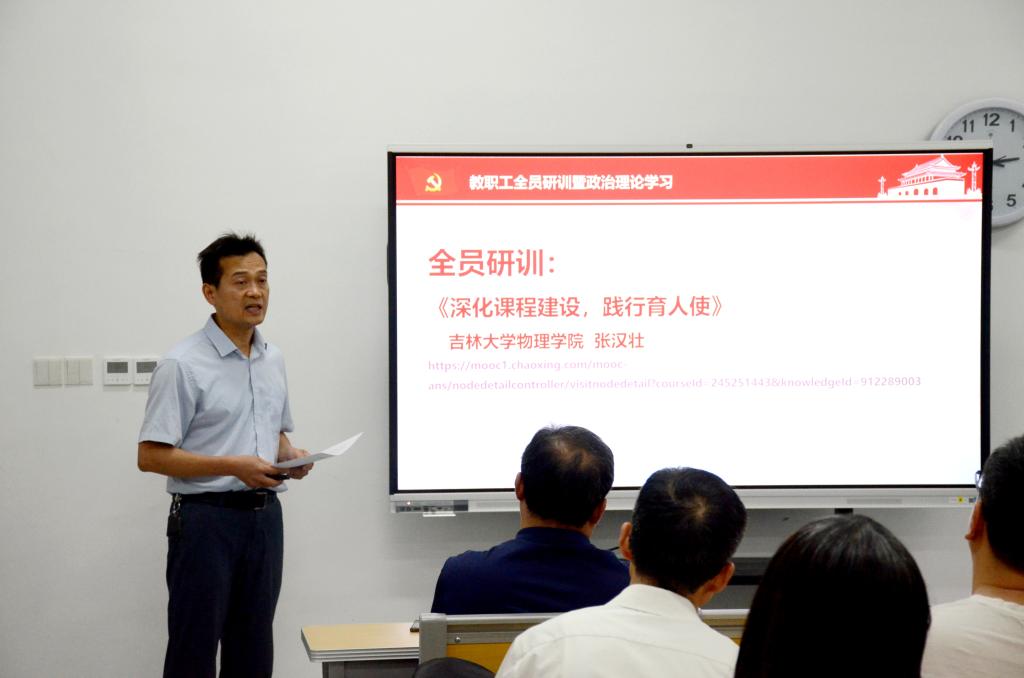 政治理论学习之后,全体教职工集中观看了吉林大学物理学院张汉壮教授主讲的《深化课程建设,践行育人使命》。张汉壮教授以“内化于心的立德树人意识”和“外化于行的努力践行措施”两部分为切入点,借助物理课程教学中的实例,深度阐释了“如何做一名教书育人的好老师”这一课题。
