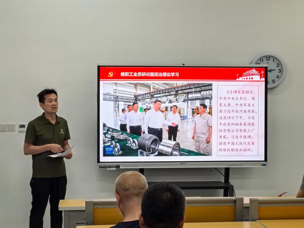 全体教职工首先集体学习了习近平总书记在河南考察时的重要讲话精神。5月19日至20日,习近平总书记先后到洛阳、郑州考察调研。习近平强调,新时代新征程,河南要认真落实党中央关于中部地区加快崛起、黄河流域生态保护和高质量发展等战略部署,坚持稳中求进工作总基调,全面深化改革开放,着力建设现代化产业体系和农业强省,着力改善民生、加强社会治理,着力加强生态环境保护,着力推动文化繁荣兴盛,以高质量发展和高效能治理奋力谱写中原大地推进中国式现代化新篇章。