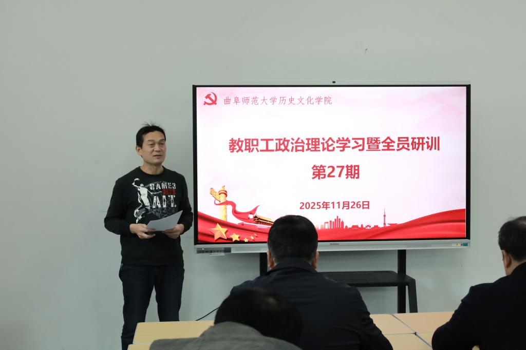 2025年11月26日下午,工口动漫 在孔子书院B106教室举行教职工政治理论学习暨全员研训第27期活动。活动由党委学习委员孙锋主持并领学,学院在校教职工60余人参加活动。